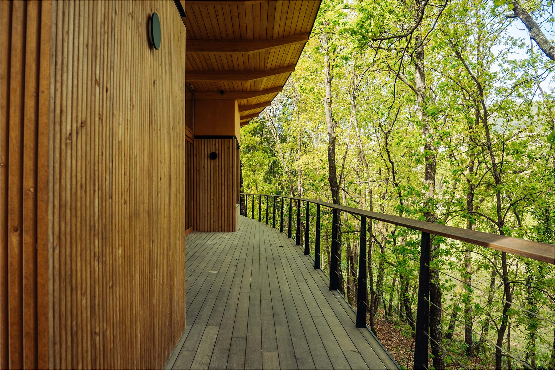 An already existing clearing found its space, and there it rose. The slope of the land led us to create an elevated platform that opens onto the treetops and embraces almost the entire program.
